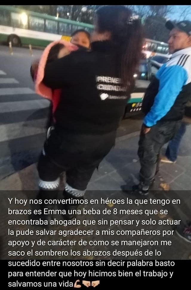“Y hoy nos convertimos en héroes la que tengo en brazos es Emma, una beba de 8 meses”. La que habla es Yanina Villarreal, integrante de la Guardia Urbana local que le salvó la vida a una criatura que se estaba ahogando. El hecho ocurrió pasadas las 18 de este martes, en uno de los locales de la Galería San Martín.
