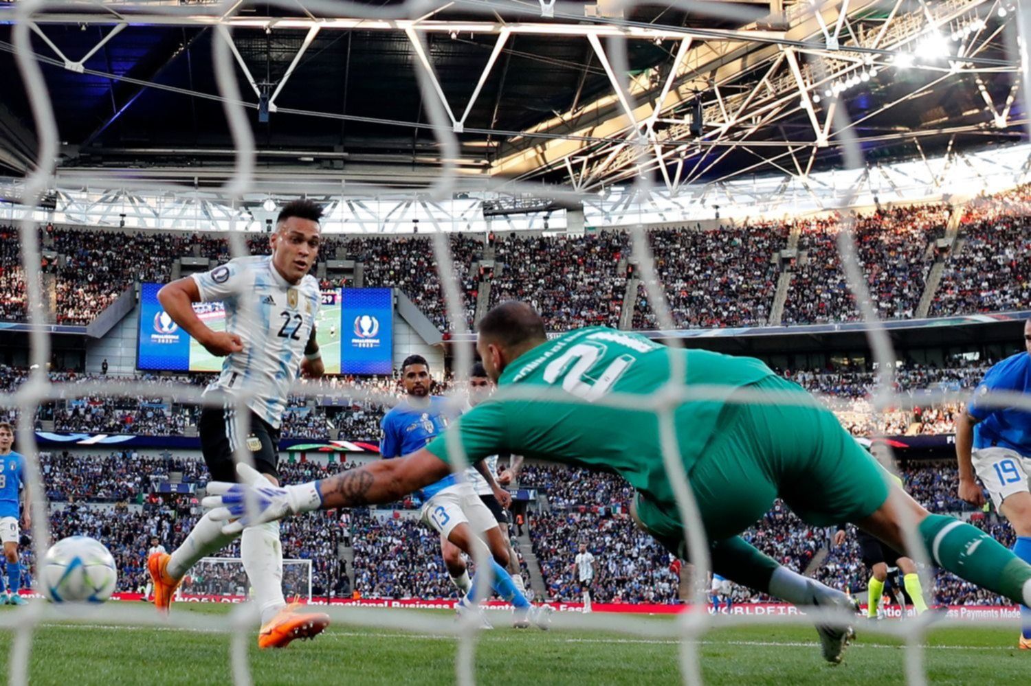 Después de un inicio parejo e intenso, Italia tuvo su momento entre los 15 y 25 minutos del primer tiempo, sin grandes ocasiones pero logró arrinconar a la Argentina en su campo. Lo mejor del tetracampeón del mundo en ese lapso, sin embargo, fueron una buena jugada por derecha que terminó en un buen cierre de Romero y un cabezazo de Andrea Belotti bien controlado por Dibu Martínez.