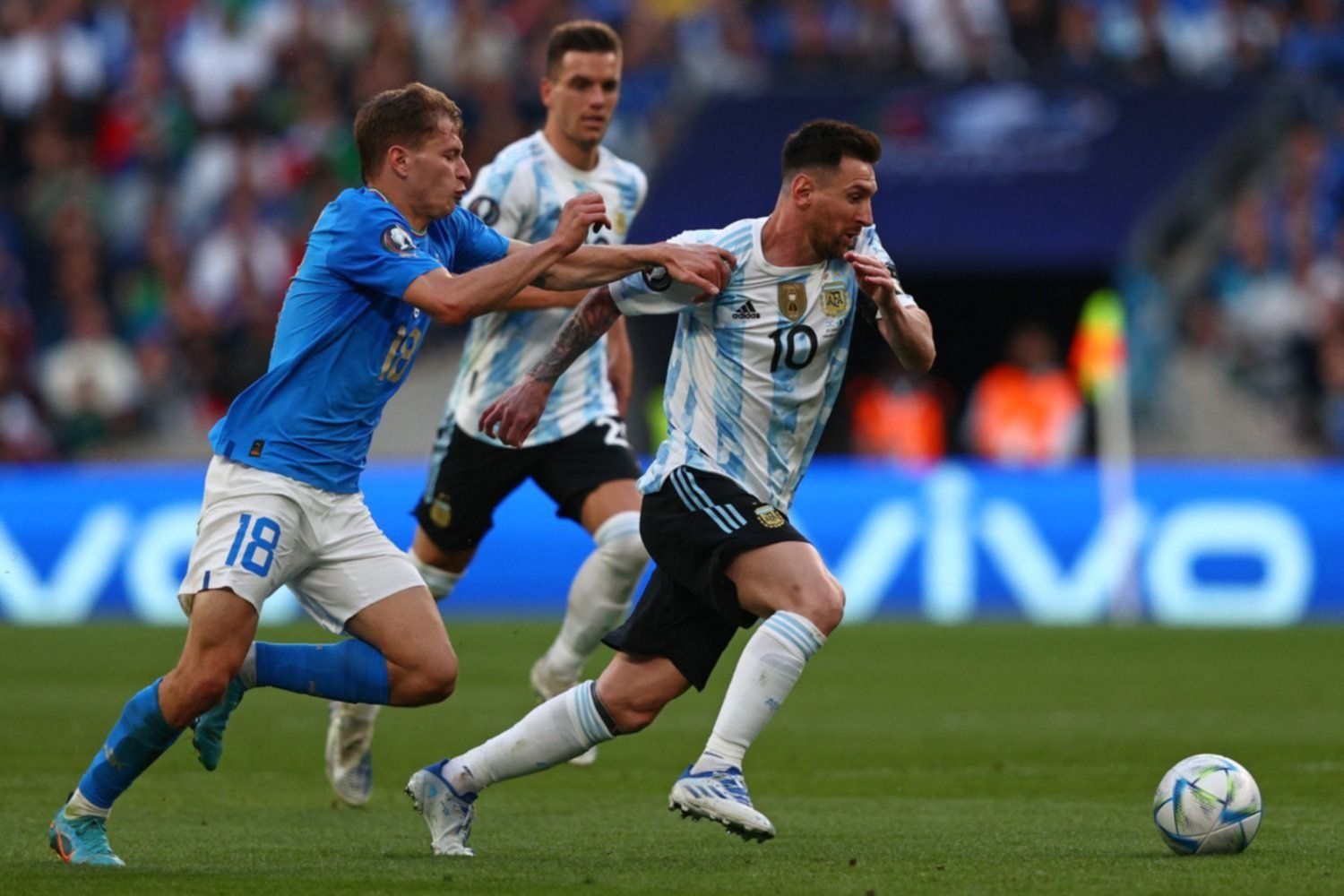 La Selección argentina superó hoy a Italia por 3-0 tras una gran exhibición de fútbol y se consagró campeón de la Finalissima en el mítico estadio Wembley de Londres. Lautaro Martínez, tras la asistencia de un gigante Lionel Messi, Ángel Di María, a los 27 y 45 minutos del primer tiempo respectivamente, y Paulo Dybala sobre el final marcaron los goles del campeón de América, que levantó un nuevo trofeo a menos de seis meses del Mundial de Qatar 2022.