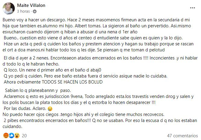 Ahora la madre expuso el padecimiento de su hoja, alumna del establecimiento: "Hace 2 meses más o menos firmé un acta en la secundaria de mi hija, donde también es alumno mi hijo, el Albert Thomas. La siguió al baño un pervertido". En su comentario, la mujer explicó que además gente que estaba en el lugar supuestamente escuchó "cuando dijeron que iban a abusar de una nena de primer año", sin que nadie habría hecho nada para impedirlo.