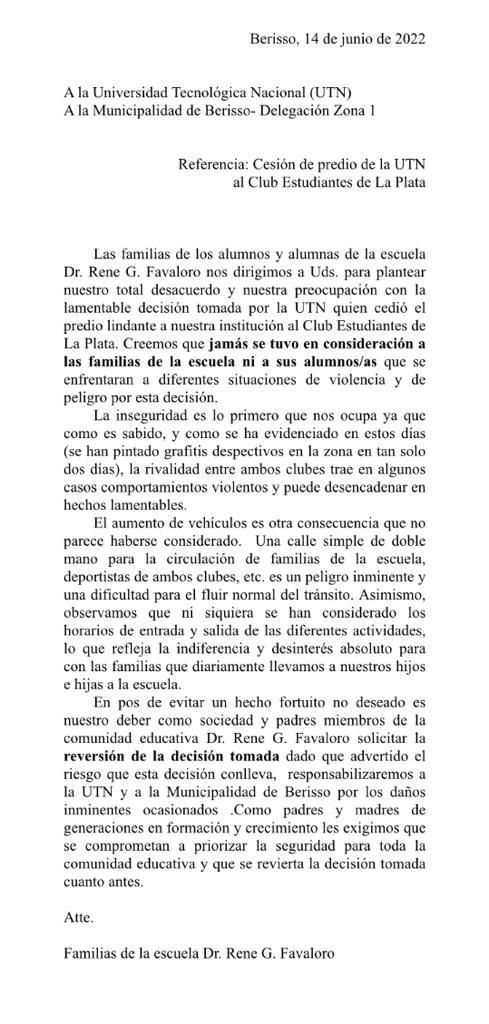 A través de una carta dirigida a la UTN y la municipalidad de Berisso, expresaron su malestar con este convenio porque “jamás se tuvo en consideración a las familias de la escuela ni a sus alumnos/as que se enfrentaran a diferentes situaciones de violencia y de peligro por esta decisión”.