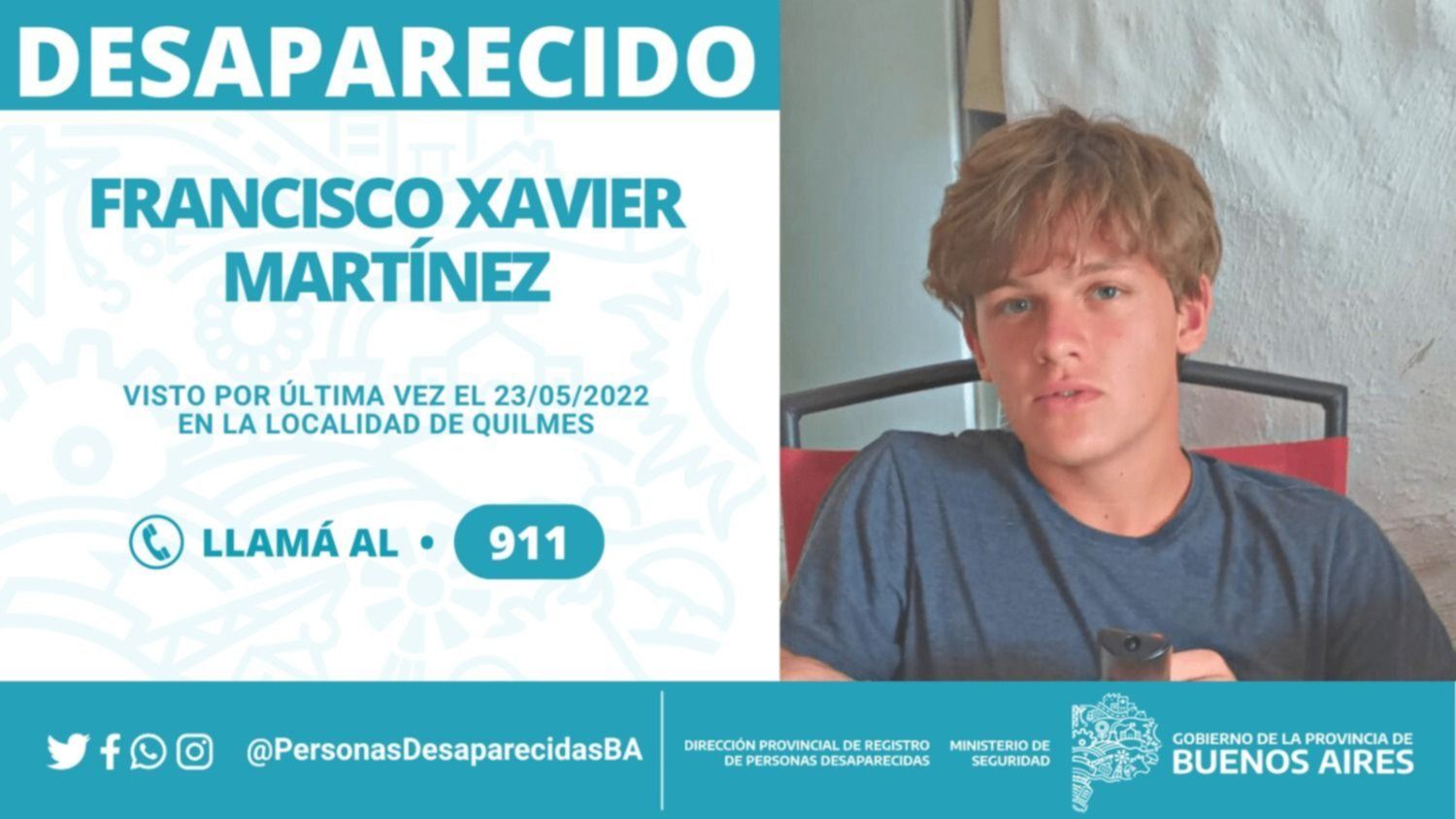 Crece la incertidumbre alrededor de la desaparición de Francisco Xavier Martínez, un adolescente de 18 años que desapareció cerca de las 21 del pasado 23 de mayo en las inmediaciones de la estación de Quilmes del tren Roca. Entonces vestía una campera inflable color azul, pantalón de color negro, zapatillas de vestir y llevaba consigo una mochila de gran tamaño, como las de un mochilero.