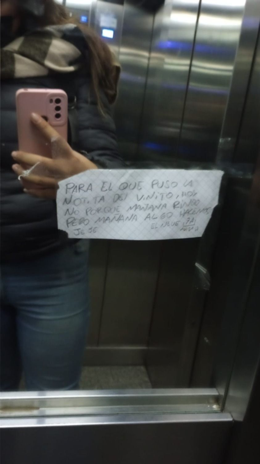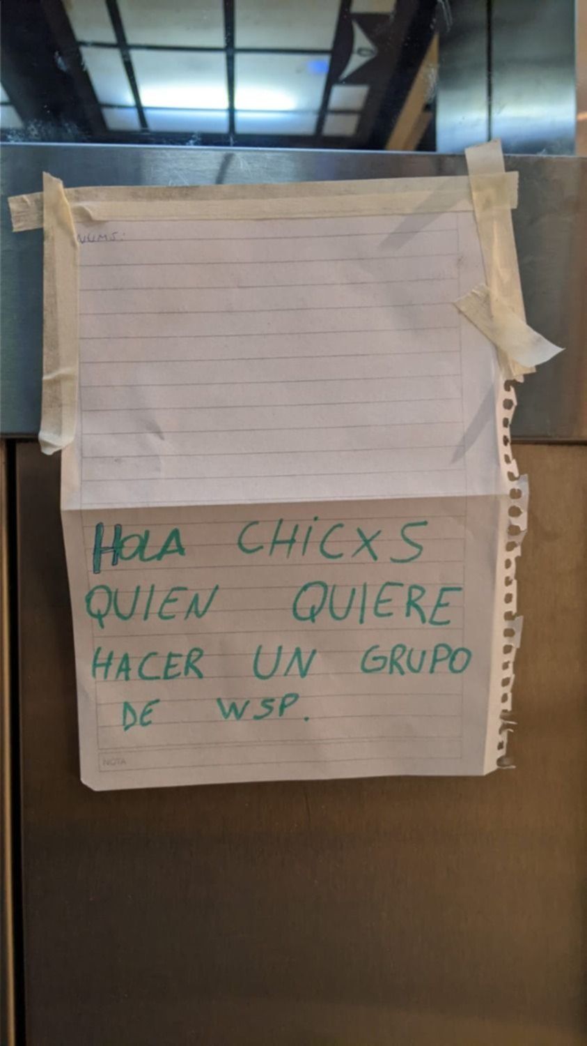 "Hola chicxs. ¿Quién quiere hacer un grupo de WhatsApp?", se lee en el último mensaje, colgado este mismo miércoles en las paredes del ascensor. Resta esperar, ahora, para saber si finalmente las charlas se volverán virtuales o si este curioso intercambio casi epistolar seguirá deleitando a quienes viven en el lugar.