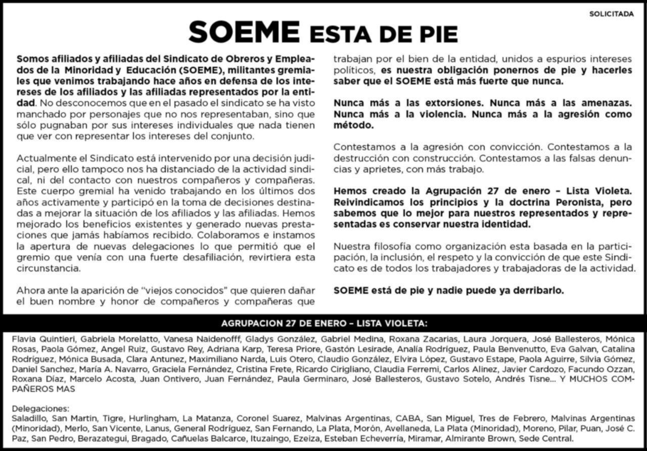 Somos afiliados y afiliadas del Sindicato de Obreros y Empleados de la Minoridad y Educación (SOEME), militantes gremiales que venimos trabajando hace años en defensa de los intereses de los afiliados y las afiliadas representados por la entidad. No desconocemos que en el pasado el sindicato se ha visto manchado por personajes que no nos representaban, sino que sólo pugnaban por sus intereses individuales que nada tienen que ver con representar los intereses del conjunto.