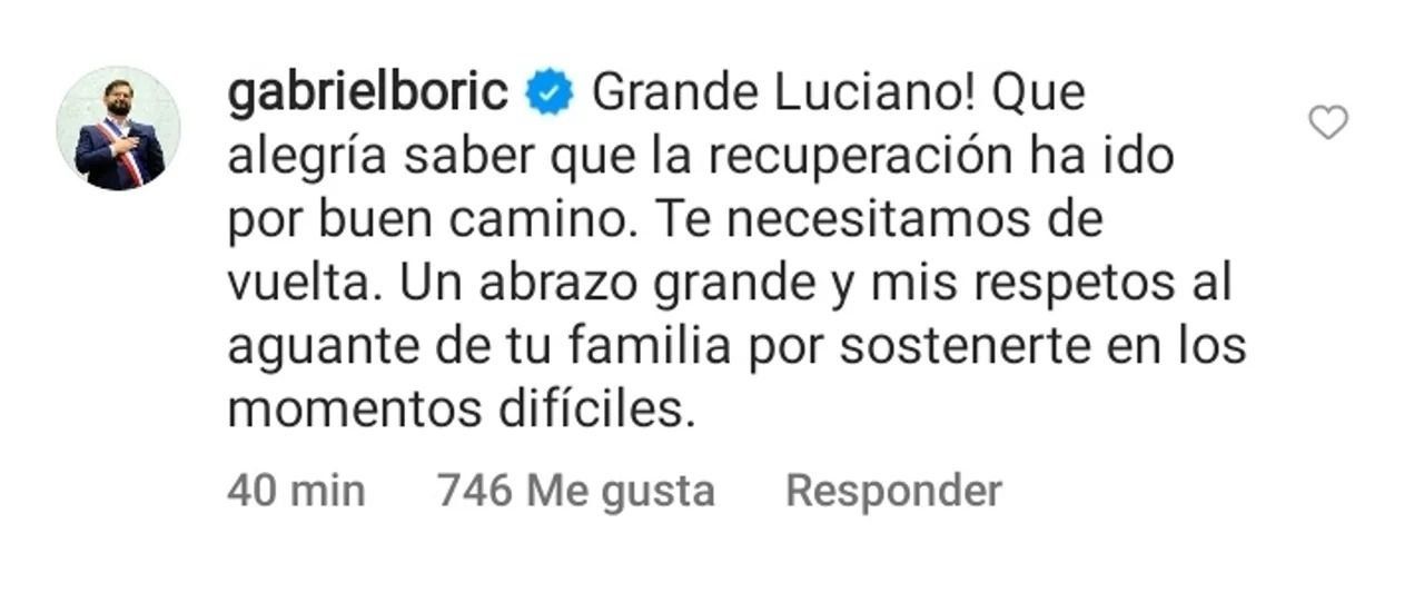 La publicación de Aued tuvo miles de respuestas pero una de ellas fue la de Gabriel Boric, presidente de Chile e hincha fanático de los 'Cruzados'. "Grande Luciano! Que alegría saber que la recuperación ha ido por buen camino. Te necesitamos de vuelta. Un abrazo grande y mis respetos al aguante de tu familia por sostenerte en los momentos difíciles", escribió el mandatario chileno.