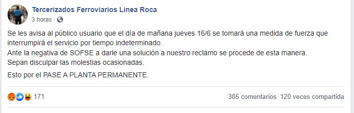 "Se les avisa al público usuario que el día de mañana jueves 16/6 se tomará una medida de fuerza que interrumpirá el servicio por tiempo indeterminado. Ante la negativa de la Operadora Ferroviaria Sociedad del Estado (SOFSE) a darle una solución a nuestro reclamo se procede de esta manera. Sepan disculpar las molestias ocasionadas", publicaron en las redes el último miércoles para dar aviso de la protesta. En ese marco, se prevé que los usuarios del servicio tengan que buscar vías alternativas para viajar en medio del paro.
