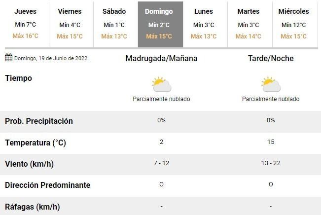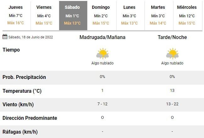 Lo peor, en tanto, llegaría el sábado, con tiempo bueno, cielo nublado y mañanas muy frías. Aunque la máxima prevista seguirá rondando los 13°C, la mínima descenderá a tan solo 1°C en el primero de los días del fin de semana.