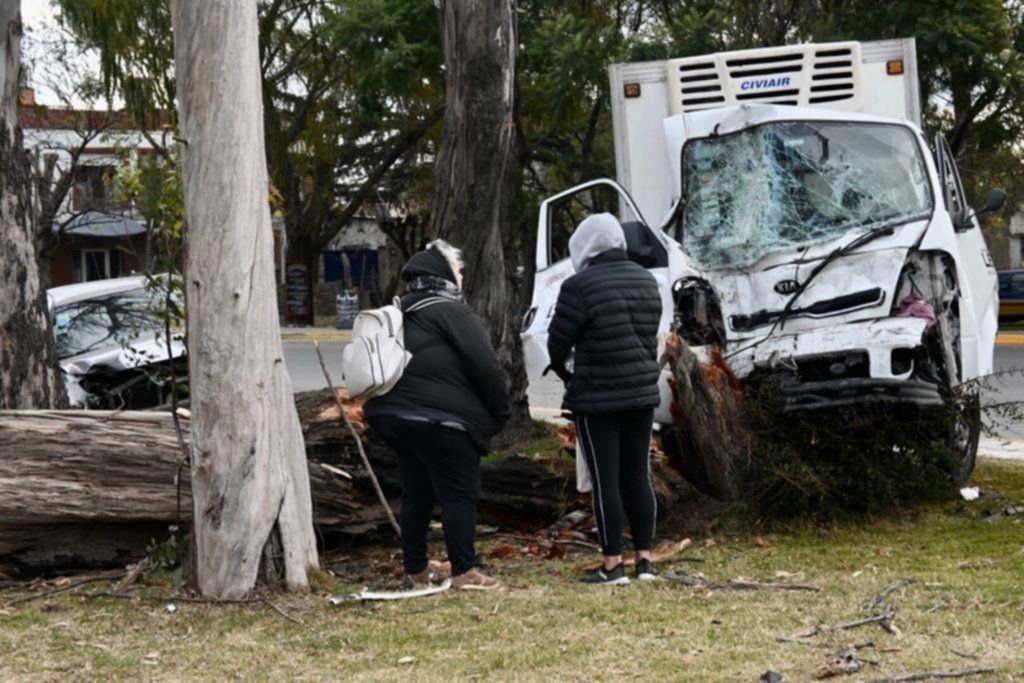 Al parecer el chofer del camión perdió el control y dio de lleno contra un árbol, que terminó tumbado y quebrado en distintas partes.