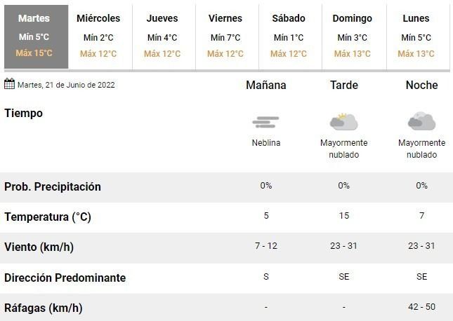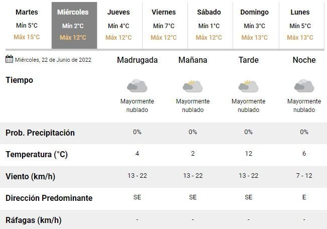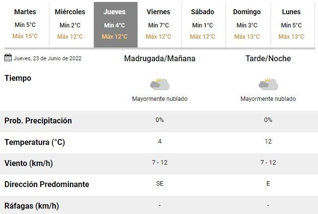 Con el sol asomando por momentos, será el día con la temperatura más alta de la semana ya que desde el miércoles hasta el domingo se esperan en promedio 12°C y mínimas apenas superando 1°C.