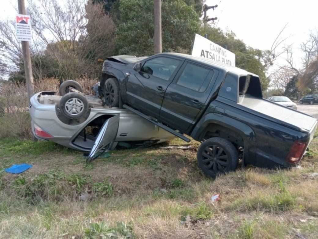 La impactante imagen habla por sí misma. La camioneta quedó completamente encima del auto al que le causó severos daños en la parte delantera y llegó a compactar el techo sobre el conductor.