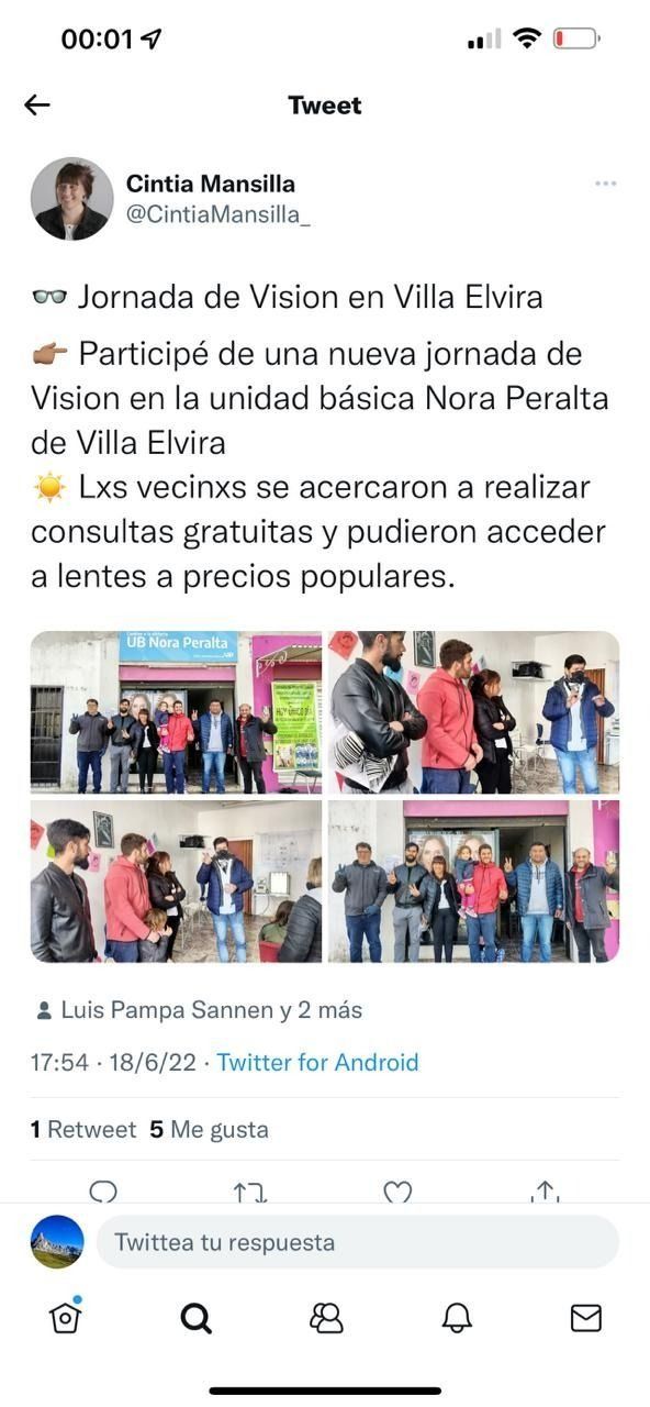 La entidad presentó una nota firmada por su presidenta Judith Pizzatti en el deliberativo platense, para pedir sanciones contra la edil y adjuntó fotos de una publicación redes sociales en la que Mansilla reveló haber participado de una "Jornada de visión" realizada en la unidad básica Nora Peralta de aquella localidad platense. "Los vecinos se acercaron a realizar consultas gratuitas y pudieron acceder a lentes a precios populares", decía el posteo compartido en Twitter.