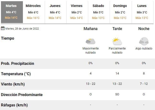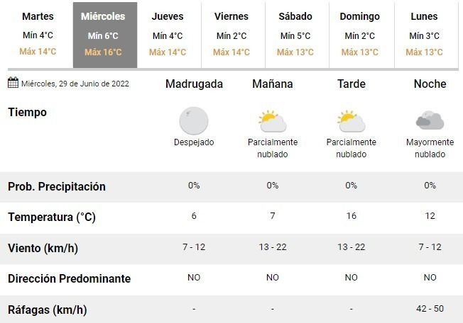La dirección de Hidrometeorología del Municipio, en tanto, pronostican una mínima de 9°C y una máxima de 16°C, un cielo nublado a parcialmente nublado y vientos leves del oeste y sudoeste, en el inicio de una semana que seguirá a puro frío.