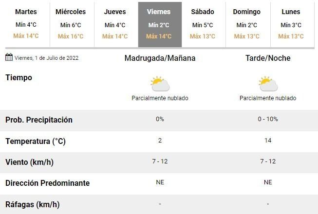 Para el viernes, el SMN prevé finalmente una temperatura de solo 2°C por la mañana, con cielo parcialmente nublado y vientos leves a moderados del noreste.
