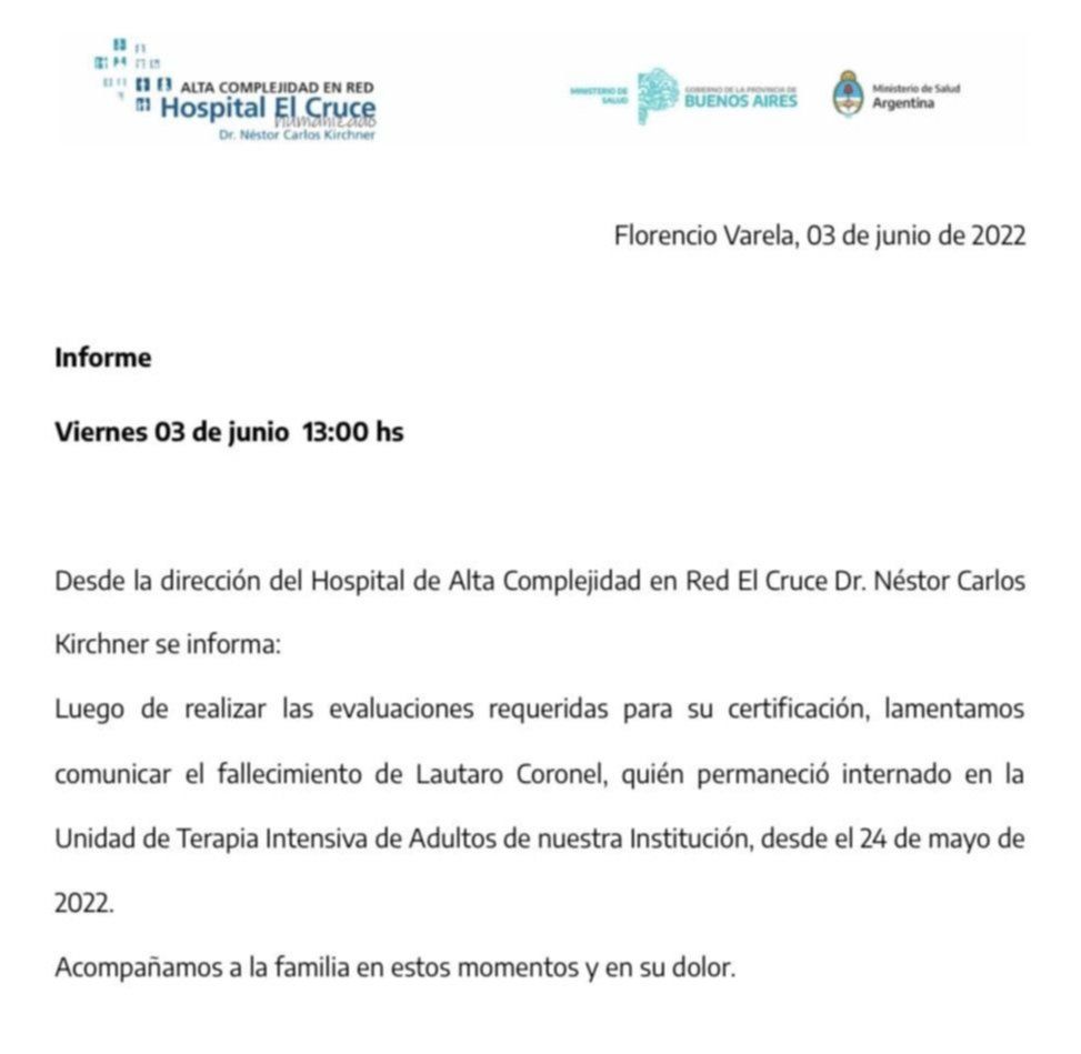 Fuentes cercanas al artista habían indicado en la tarde del jueves que ya no tenía "actividad neuronal" y confirmado su "muerte cerebral". No obstante, este viernes las autoridades del centro de salud confirmaron la triste noticia a través de un comunicado oficial: "Luego de realizar las evaluaciones requeridas para su certificación, lamentamos comunicar el fallecimiento de Lautaro Coronel, quién permaneció internado en la Unidad de Terapia Intensiva de Adultos de nuestra institución, desde el 24 de mayo de 2022. Acompañamos a la familia en estos momentos y en su dolor", indicaron.
