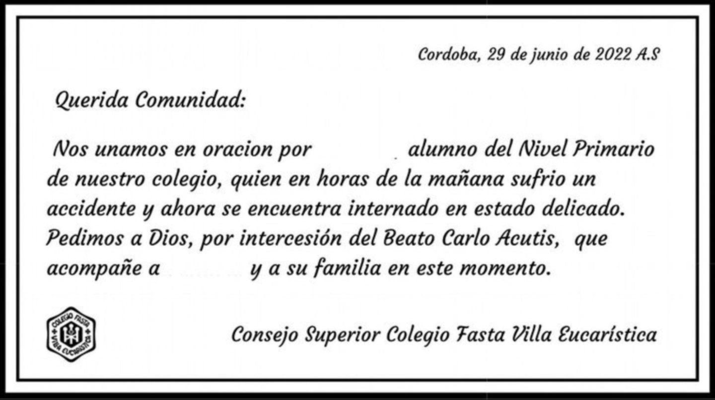 El Consejo Superior del Colegio Fasta Villa Eucarística, donde todo sucedió, publicó un breve mensaje tras lo sucedido, en el que solicitaron unirse a la oración por su alumno. "Pedimos a Dios, por intercesión del Beato Carlos Acutis, que acompañe a él y a su familia en este momento", agregaron.
