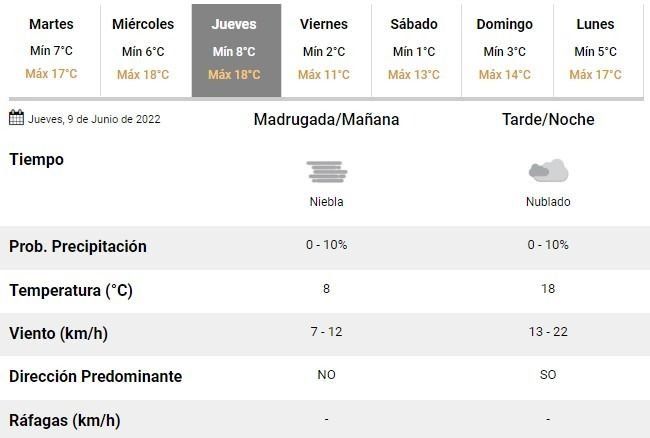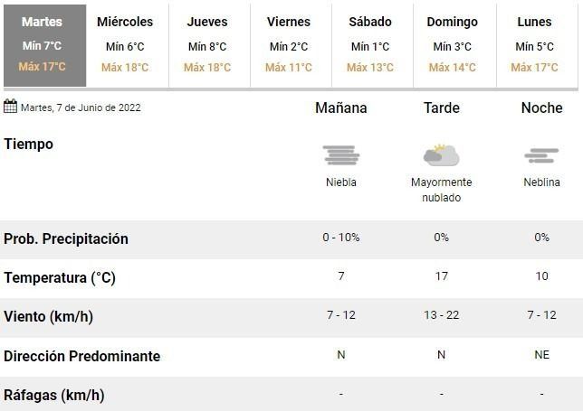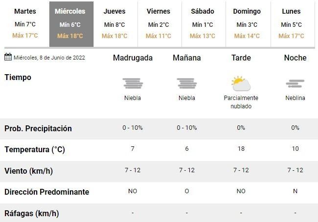 Las previsiones de los meteorólogos argentinos indican que, hasta el jueves, las condiciones de tiempo se mantendrán más o menos similares. Los expertos aguardan por un miércoles de entre 6 y 18°C y un jueves con una temperatura oscilando entre 8 y 18°C. Para ambas jornadas se espera también más niebla, con leves vientos soplando mayormente desde el norte y noroeste.