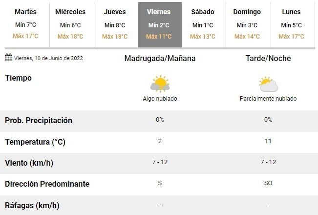 El viernes, finalmente, volvería salir el sol. Los especialistas argentinos prevén un cielo con algo menos de nubosidad que las jornadas previas y un sensible descenso de la temperatura que irá de unos 2°C de mínima a unos frescos 11°C de máxima.