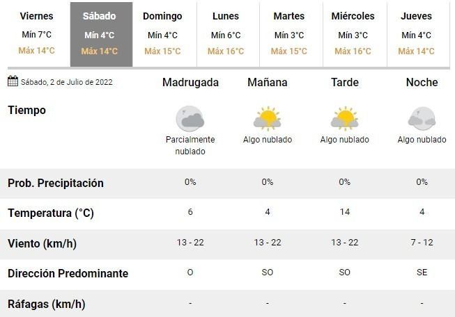 De acuerdo con el pronóstico de los especialistas, la buena nueva es que solo se esperan precipitaciones durante esta jornada y es que el fin de semana transcurriría con un excelente tiempo en la ciudad y un cielo apenas nublado, con mañanas frescas y máximas rondando en los 14°C.