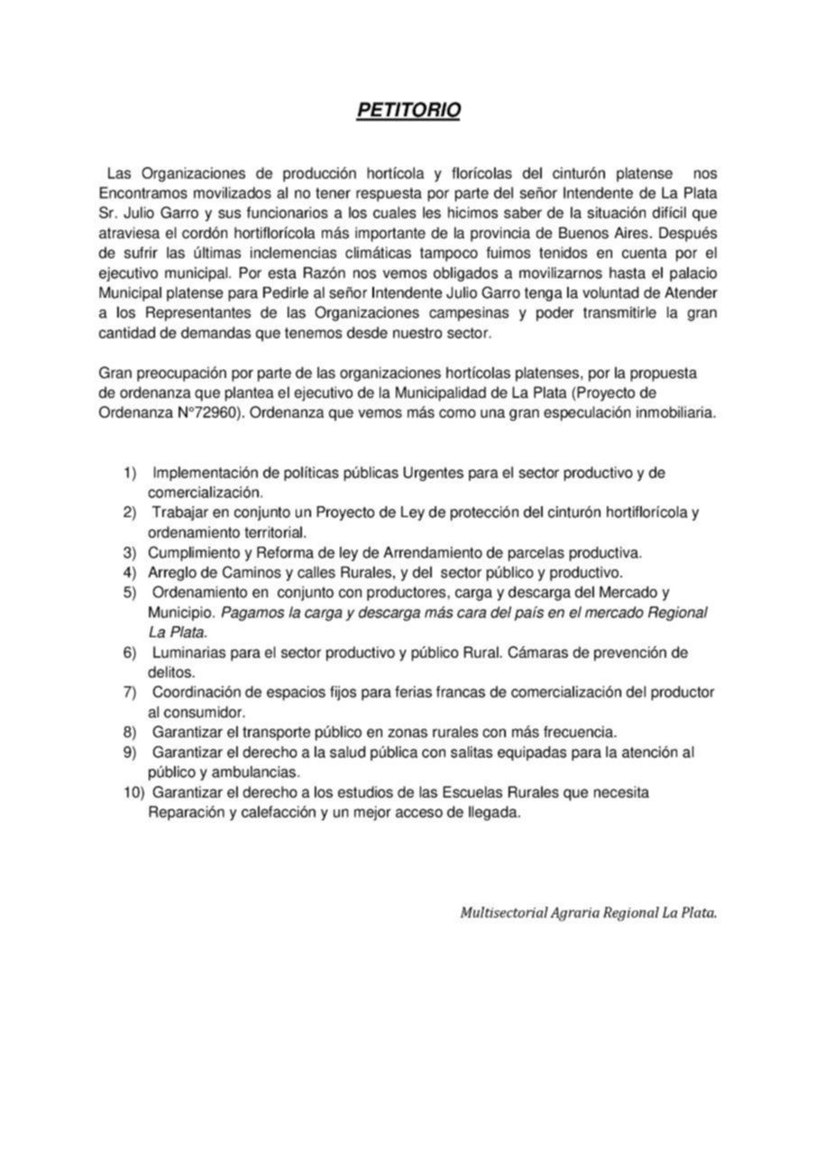 Un grupo de productores protestaron y se hicieron oír este martes en pleno centro de La Plata. Con banderas, bombos, pero sobre todo con frutas y verduras, se instalaron en Plaza Moreno, frente a la Municipalidad de La Plata.