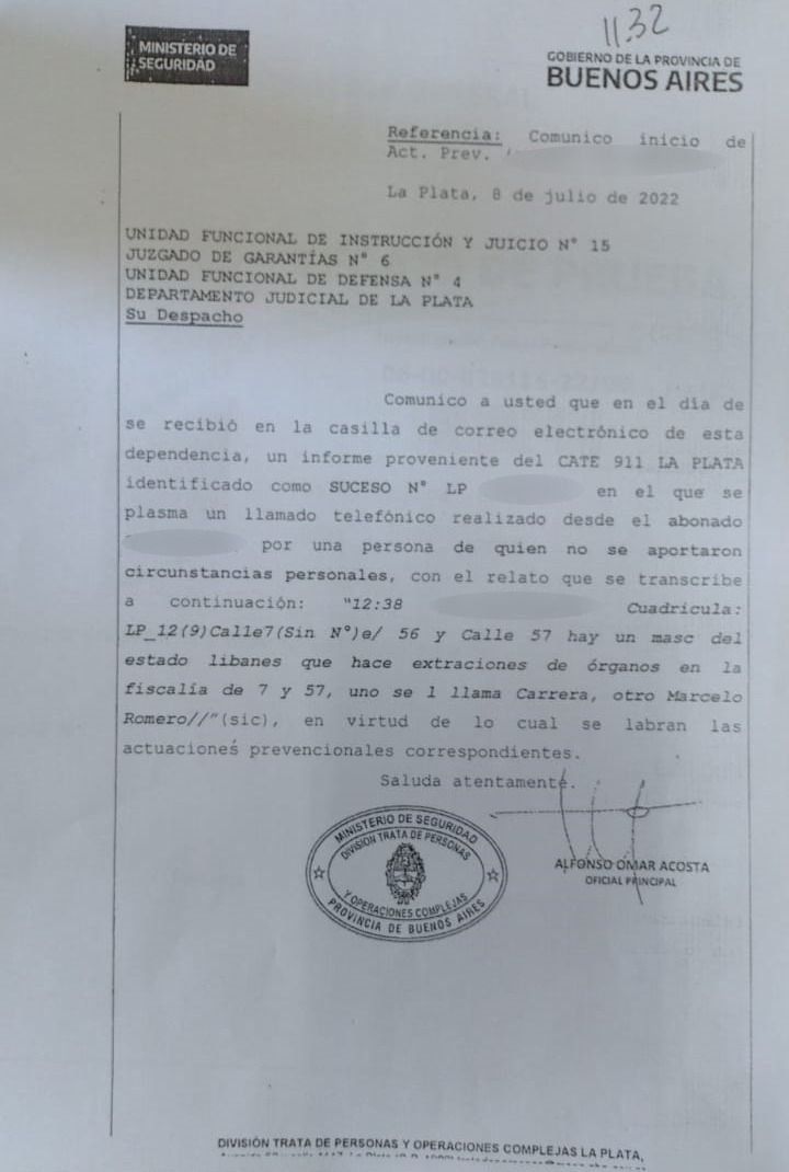 “Hay un masculino del estado libanés que hace extracciones de órganos en la fiscalía 7 y 57, uno se llama Carrera, el otro Marcelo Romero”, se destaca en el documento donde se deja constancia de este llamado telefónico.