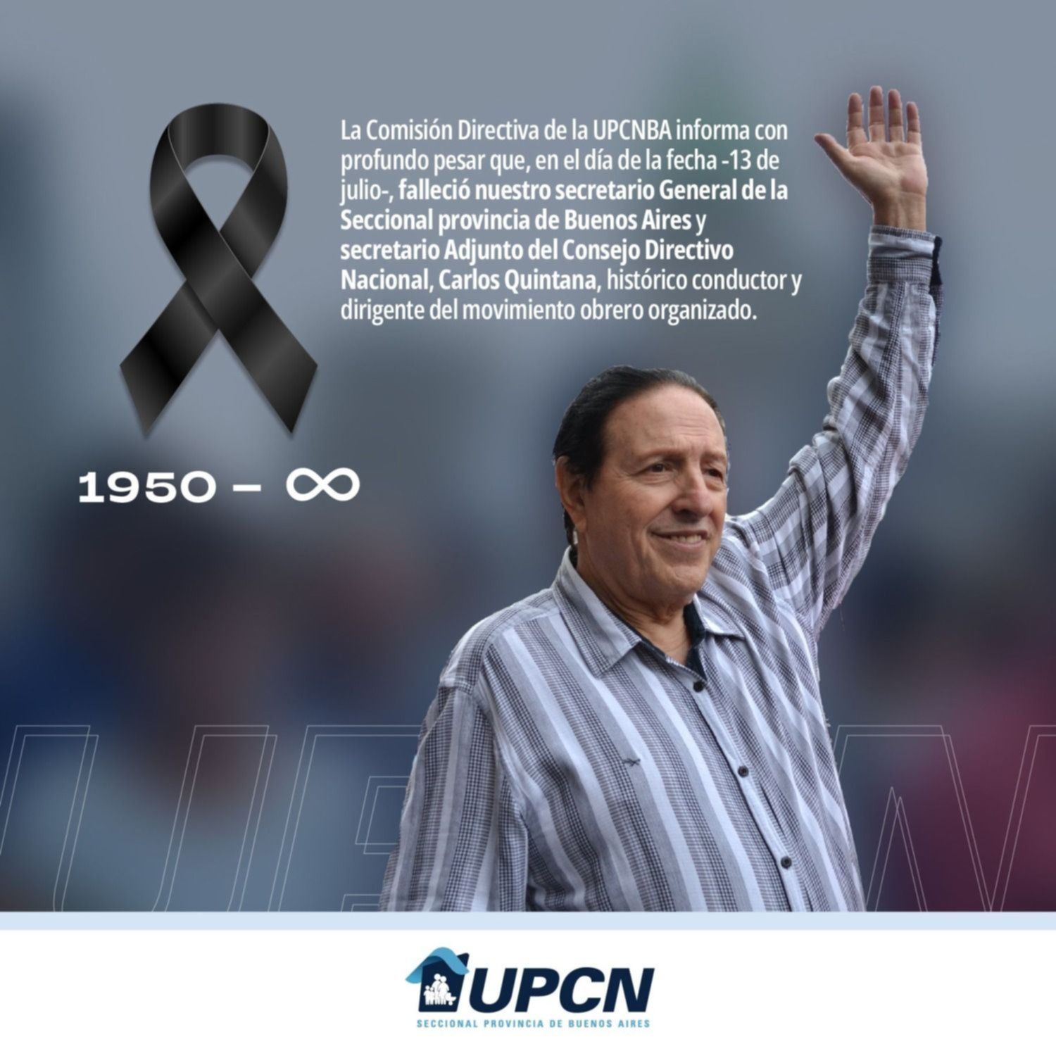 Carlos Quintana, titular de la Unión de Personal Civil de la Nación (UPCN) de la provincia de Buenos Aires, falleció este miércoles tras haber pasado un largo tiempo internado a raíz de una enfermedad y sera despedido en una de las dependencias emblemáticas que el gremio tiene en la ciudad.