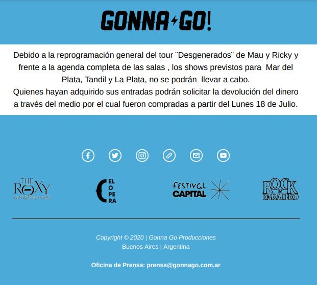 "Debido a la reprogramación general del tour 'Desgenerados' de Mau y Ricky y frente a la agenda completa de las salas, los shows previstos para Mar del Plata, Tandil y La Plata, no se podrán llevar a cabo", explicaron en la productora Gonna Go a través de un comunicado y aclararon así que los fanáticos platenses deberán esperar para recibir al dúo venezolano en la ciudad.