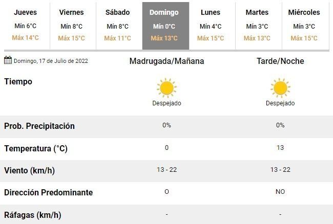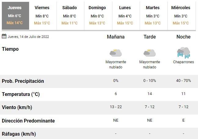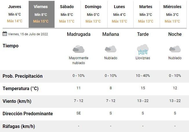 La semana cerrará además con condiciones similares. Los especialistas prevén un viernes de entre 8 y 15°C, cielo nublado a mayormente nublado y algunas lloviznas aisladas en horas de tarde.