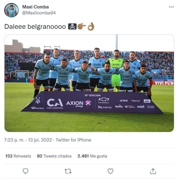 En medio de los festejos las cámaras de la TV captaron claramente a Comba realizando gestos para burlarse de la eliminación de Estudiantes y, minutos más tarde, también hizo lo mismo en las redes sociales. "Dale Belgranoooo", escribió junto a varios emojis que generaron un fuerte repudio de todos los hinchas pincharratas.