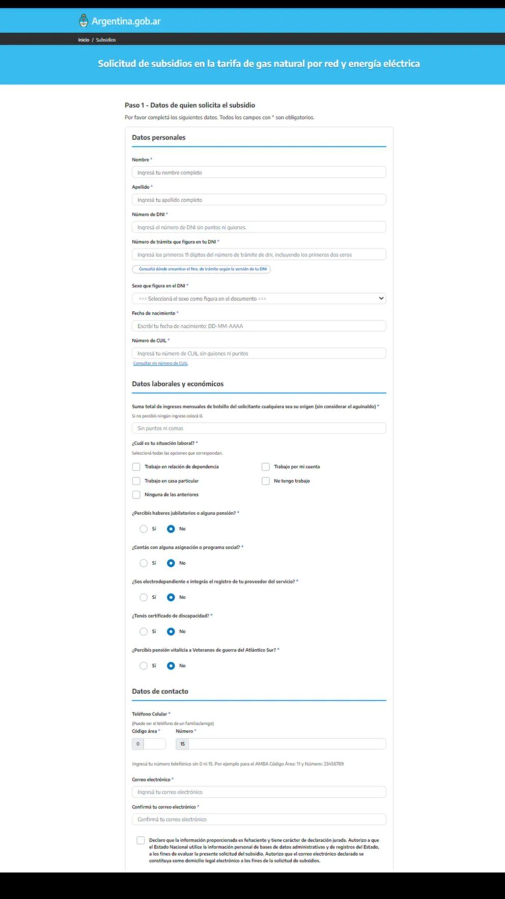 “Estás por solicitar los subsidios a los servicios de energía eléctrica y gas natural por red para los usuarios y usuarias residenciales otorgados por el Estado Nacional. Tiene carácter de Declaración Jurada y deberás completarlo sin omitir ni falsear ningún dato. Al aceptar la opción que sigue autorizás al Estado Nacional a verificar la veracidad de toda la información que vas a brindar en fuentes disponibles en organismos tales como AFIP, SINTyS, ANSES, Registros de la Propiedad, entre otros, renunciando expresamente a oponer a esa verificación cualquier secreto previsto legalmente (fiscal, financiero u otro)”, dice la advertencia.
