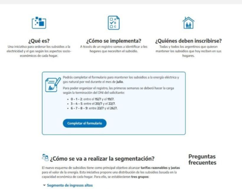 El Gobierno activó en la página www.argentina.gob.ar/subsidios y la aplicación Mi Argentina el formulario para la inscripción de usuarios de cara a la segmentación de las tarifas, que comenzará a regir a partir del 1 de agosto.