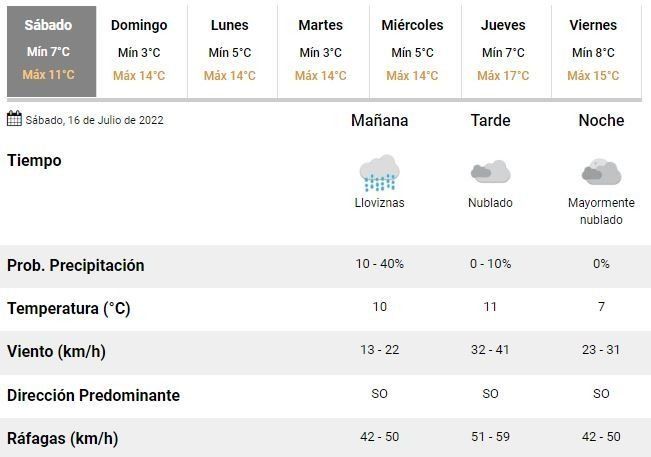Para el domingo se espera un día de sol, aunque más frío: los meteorólogos indicaron que la mañana abrirá con solo 3°C y durante la tarde se registrará un leve ascenso de la temperatura hasta llegar a unos 14°C. Será el inicio de una seguidilla de días soleados pero con temperaturas muy bajas durante las primeras horas, siempre entre los 3 y 5°C.