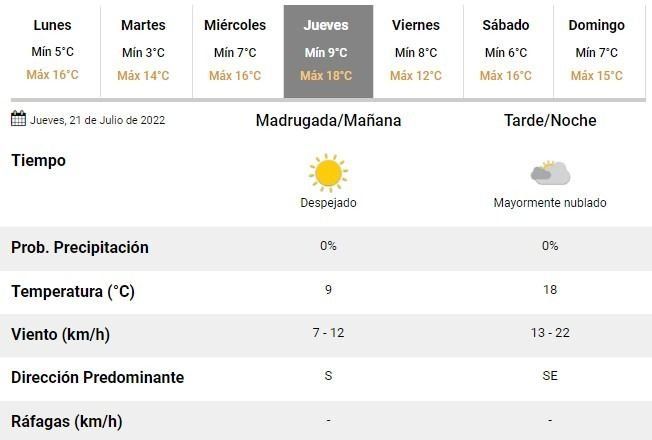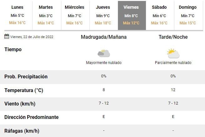 Las previsiones del tiempo para lo que resta de la semana, en tanto, son buenas. Para los próximos miércoles, jueves y viernes los expertos prevén mínimas de entre 7 y 9°C y máximas rondando los 16, 18 y 12°C, respectivamente.