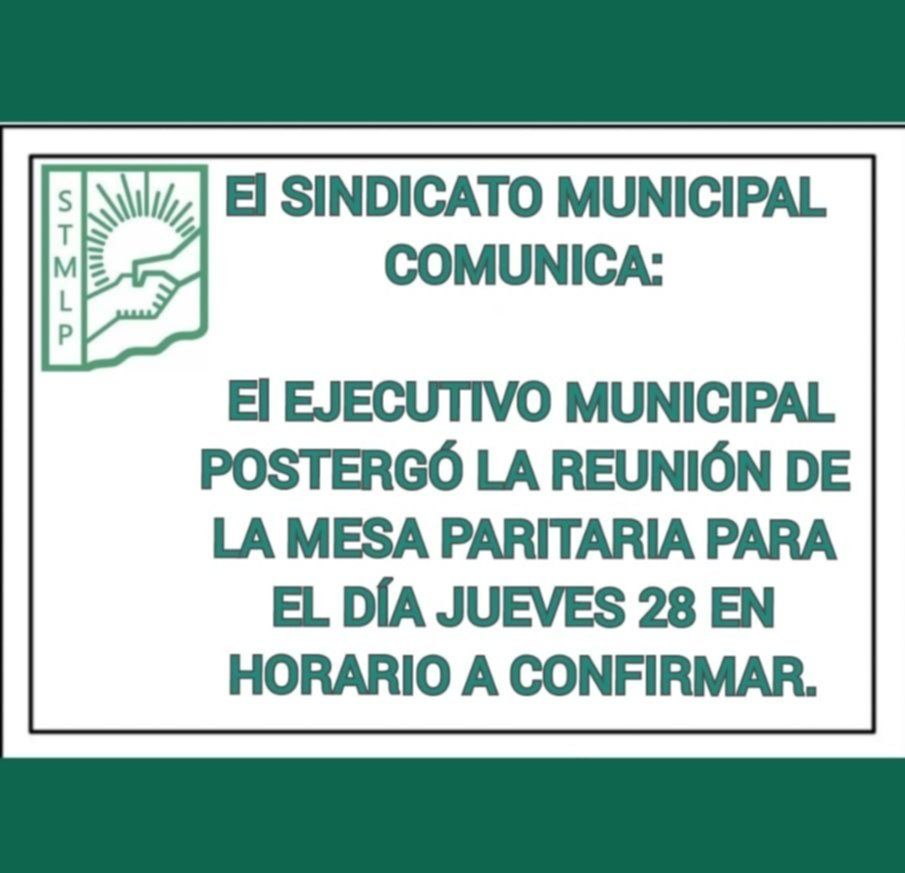 La reunión que se iba a realizar este martes entre autoridades municipales y dirigentes de los gremios con representación entre los trabajadores de la Comuna fue postergada y se realizaría el próximo jueves o el lunes siguientes.