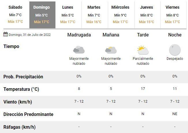Pero esta será solo el primero de dos días con excelente tiempo en la ciudad y es que, aunque con algo más de nubosidad, los meteorólogos argentinos prevén un domingo con buen clima, una temperatura de entre 5 y 17°C y ninguna chance de lluvia en el horizonte.
