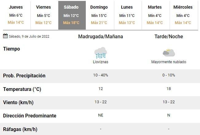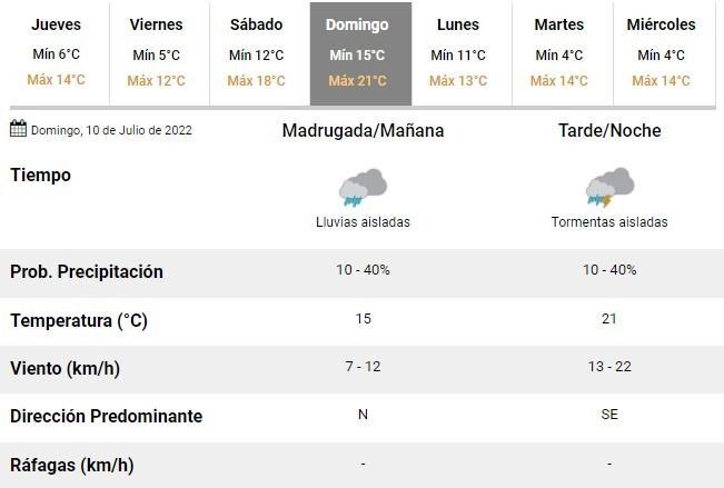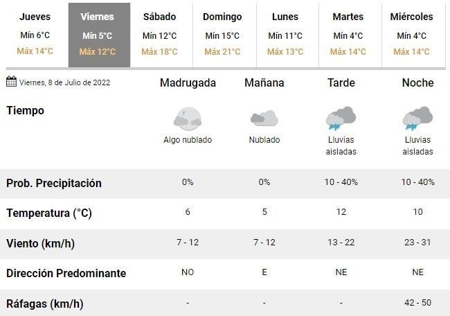 Aunque con descenso progresivo de la temperatura, por su parte, la próxima semana comenzaría con mejores condiciones climáticas, cielos algo a parcialmente nublados y temperaturas que el lunes oscilará entre 11 y 13°C y el martes y el miércoles entre 4 y 14°C.