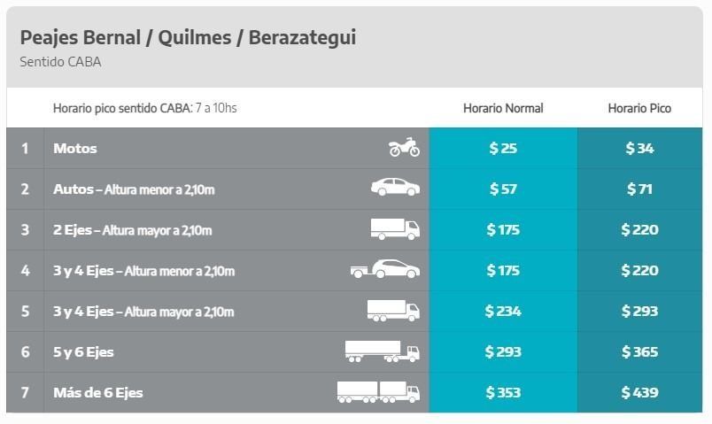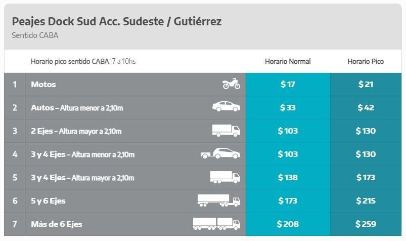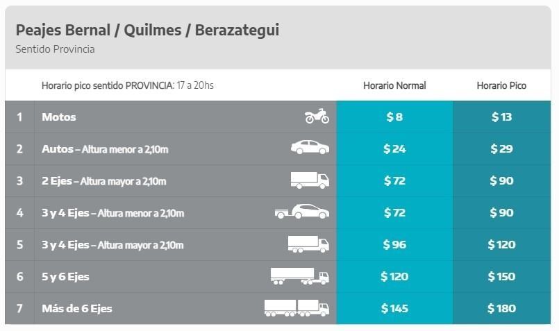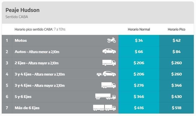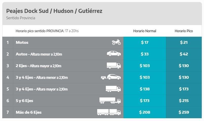 Por ello, de concretarse los aumentos planificados, los peajes costarían: en sentido a La Plata, el peaje Dock Sud para los autos pasaría de $33 a $50 en horario habitual, y de $42 a $60 en hora pico; y de $24 a $40 y $29 a $50 el siguiente peaje, respectivamente. Mientras que, en sentido a Buenos Aires, en Hudson el peaje para los autos costará $100 y $120, en lugar de los actuales $66 y $84.