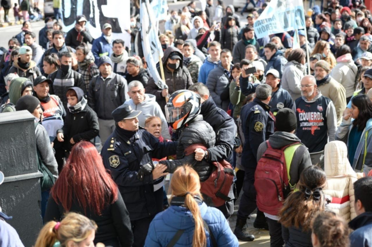 Los agentes debieron separar a los manifestantes y rodear al motociclista involucrado para escoltarlo lejos de quienes protestaban en el lugar, evitando que la situación escalara fuera de proporción. Todavía con el casco puesto, el conductor y su moto fueron llevados hasta una zona más apartada, calmando así tanto al hombre como a los trabajadores que se congregaron este mediodía para hacer oír sus reclamos.