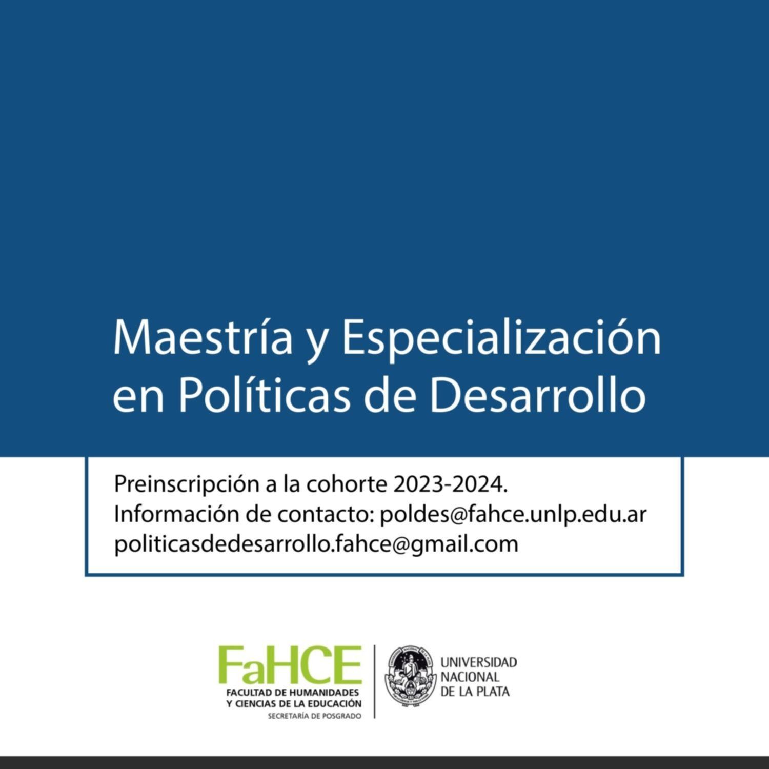La Facultad de Humanidades de la UNLP anunció las inscripciones a la cohorte 2023 de la Maestría y Especialización del Programa de Posgrado en Políticas de Desarrollo, dirigido por Patricio Narodowski y Luis Adriani. Se trata de dos carreras complementarias: el trayecto formativo de la Especialización puede realizarse como paso intermedio de la Maestría.