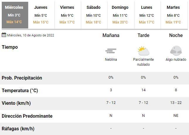 El tercero de los días de la semana arrancó fresco y con neblinas, pero con el correr de las horas la niebla comenzó a disipar y se aguarda por una jornada solo parcialmente nublada y con bastante sol en la ciudad. Los meteorólogos prevén un buen clima, con una máxima de 14°C y vientos leves soplando desde el norte.