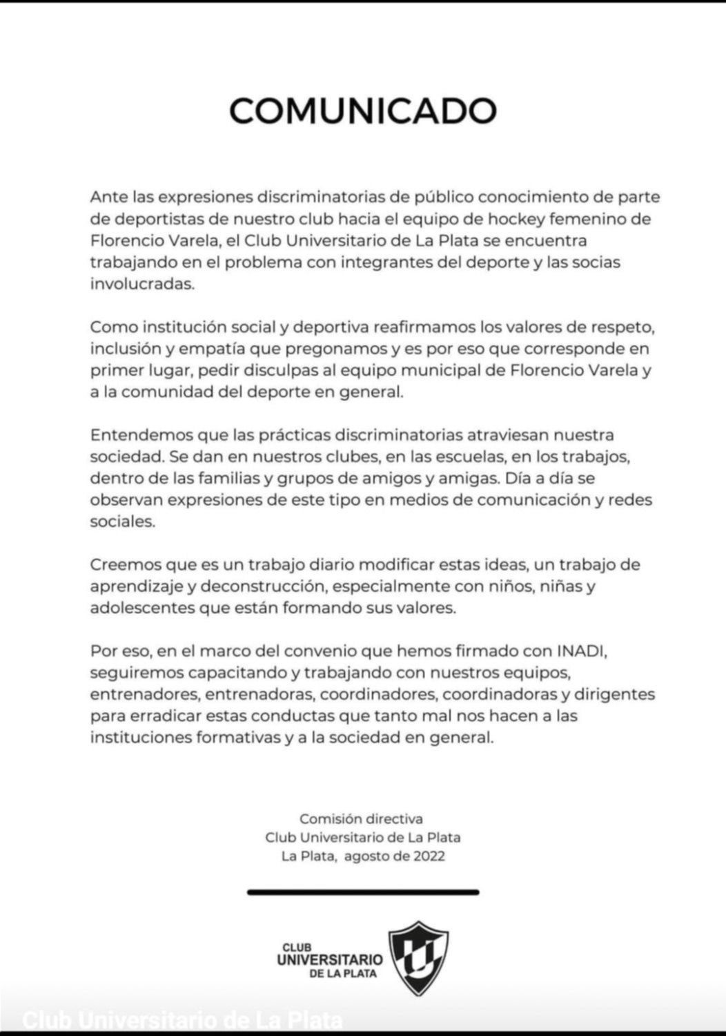 En este marco, el hecho provocó todo tipo de repudio y desde el club publicaron un comunicado en el que pidieron disculpas al plantel comunal de Varela: “Ante las expresiones discriminatorias de público conocimiento de parte de deportistas de nuestro club hacia el equipo de hockey femenino de Florencio Varela, el Club Universitario de La Plata se encuentra trabajando en el problema con integrantes del deporte y las socias involucradas. Como institución social y deportiva reafirmamos los valores de respeto, inclusión y empatía que pregonamos y es por eso que corresponde en primer lugar, pedir disculpas al equipo municipal de Florencio Varela y a la comunidad deportiva en general”, expresaron en el escrito.