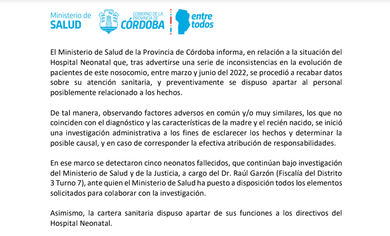 Para el Ministerio de Salud la principal hipótesis es que las muertes fueron intencionales dado que los recién nacidos tenían lesiones en la piel “no acordes a la evolución de un niño sano que está cursando las primeras horas de nacido”. Fuentes del hospital informaron a La Voz que los bebés habrían experimentado un cuadro de “hipoglucemia severa” y de manera repentina, por ende, “no llama la atención el número de muertes sino el motivo de las muertes”, planteó.