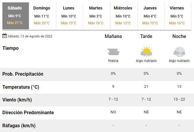 Para el domingo se esperan condiciones muy similares. Los especialistas anticipan una mañana de 11°C y una tarde con 20°C, aunque hacia la noche el tiempo desmejorará rápidamente y no se descartan tormentas y lluvias aisladas a última hora del día.