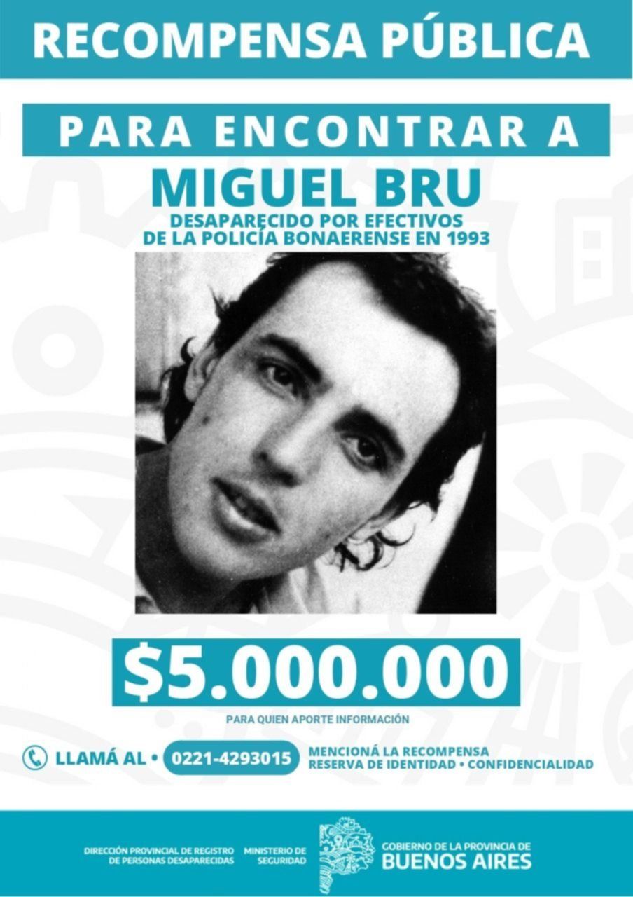 A 29 años de la desaparición de Miguel Bru, el Gobierno de la Provincia de Buenos Aires incrementó la recompensa hasta 5 millones de pesos para toda persona que aporte información fehaciente para encontrar su cuerpo. Así lo informaron desde la Dirección de Personas Desaparecidas del Ministerio de Seguridad.