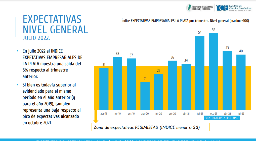Con respecto a las expectativas generales para mediados de este año, convulsionado por la inestabilidad en el ministerio de Economía nacional, el índice en La Plata mostró una caída del 6% respecto del trimestre anterior. "Si bien es todavía superior al evidenciado para el mismo período en el año anterior (y para el año 2019), también representa una baja respecto al pico de expectativas alcanzado en octubre 2021", se indicó.