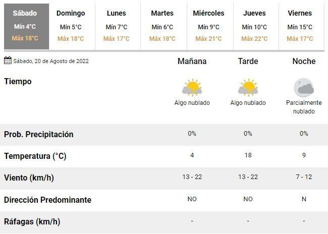 El clima transcurriría, además, casi sin cambios a lo largo del domingo. Los expertos esperan una mañana fría para el último de los días del fin de semana y una jornada con algo más de nubosidad, pero aun así con sol y una temperatura máxima que también llegaría a los 18°C durante la tarde.