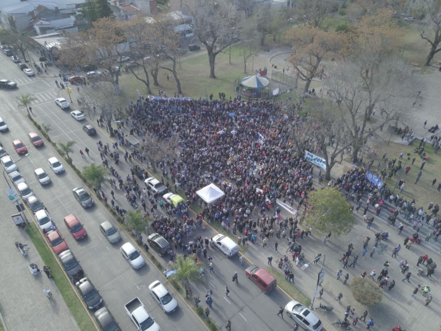 Bajo el lema "Todos con Cristina", la movida en la plaza de 13 y 40 fue convocada por redes sociales el viernes. La idea era hacer una radio abierta, también generar espacios de debate para reflexionar sobre el pedido de pena a 12 años de prisión e inhabilitación perpetua para ocupar cargos públicos que recae sobre Fernández de Kirchner en el marco del juicio por la causa conocida como “Vialidad”.