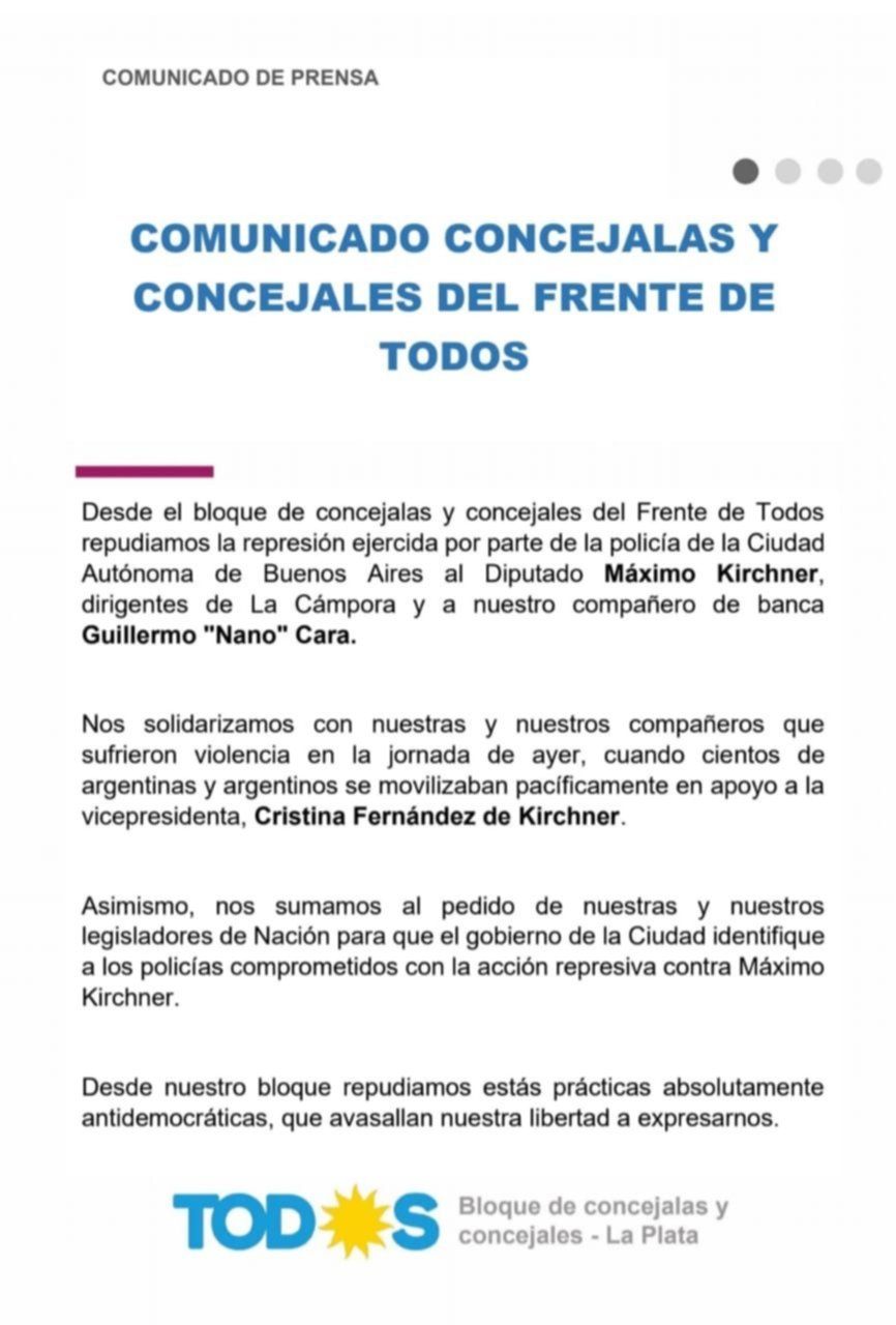 A su vez, el bloque de concejalas y concejales del Frente de Todos La Plata se sumó a este rechazo tras las agresiones contra el edil Guillermo "Nano" Cara. "Nos solidarizamos con nuestras y nuestros compañeros que sufrieron violencia en la jornada de ayer, cuando cientos de argentinas y argentinos se movilizaban pacíficamente en apoyo a la vicepresidenta, Cristina Fernández de Kirchner", expresaron en un comunicado.
