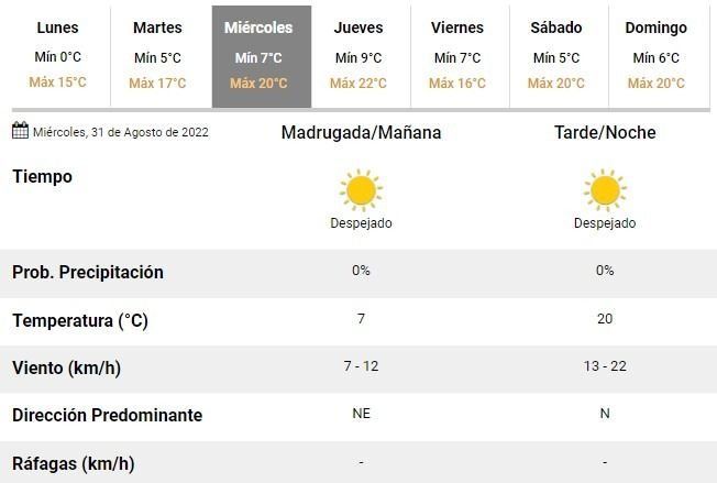 Para el fin de semana, finalmente, se espera un clima difícil de mejorar, cielos sin nubes, mucho sol y temperaturas de entre 5 y 20°C el sábado y 6 y 20°C el domingo.