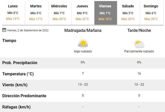 El viernes cerraría además con buenas condiciones de tiempo, una temperatura oscilando entre 7 y 16°C y un cielo algo a parcialmente nublado.
