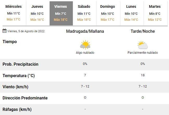 En el SMN anticipan, en ese sentido, un jueves y un viernes con mínimas de 10 y 7°C y máximas de hasta 16 y 18°C, respectivamente. Serán dos jornadas con nubosidad variable y bastante humedad, aunque sobre el cierre de la semana podrían mejorar las condiciones climáticas y el sol podría dejarse ver más que durante los días previos.